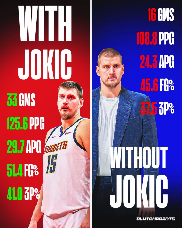 约基奇没有出场16场比赛,掘金场均得分108.8分,24.3助,命中率45.6%,三分37.5%。