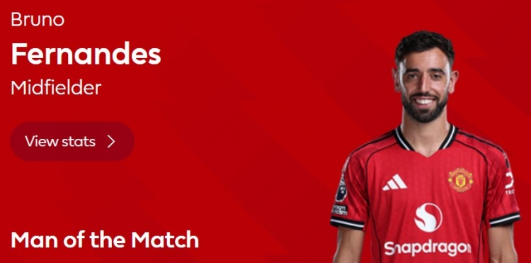 本场比赛B费送出2次助攻,赛后他也当选英超官方球迷票选全场最佳球员。